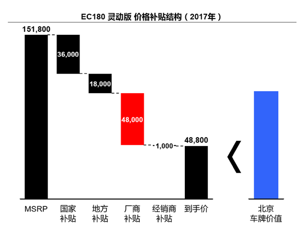 在北京,经过国家补贴、城市政府补贴、北汽厂商补贴(通过关联方卫蓝基金)、少许的经销商促销,消费者最终购入北汽EC的裸车价格,仅仅只有指导价的1/3左右,在5万左右。