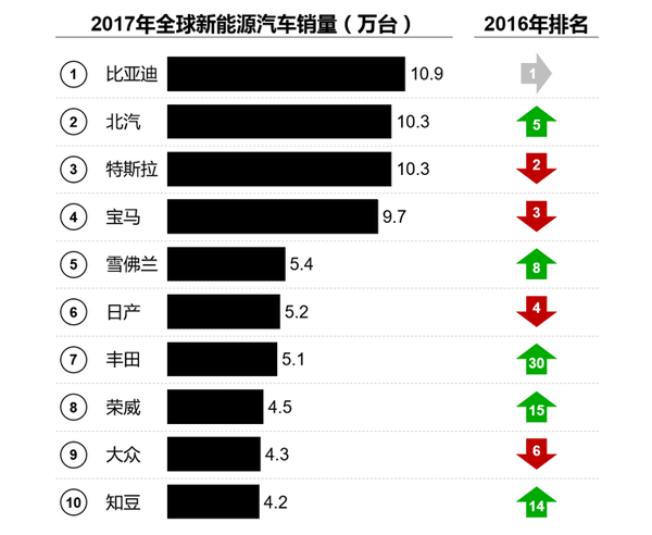 而且,其上升势头极为迅猛。2015年北汽新能源车还排在全球12名,16年进步到第5名,17年就冲到了亚军位置。