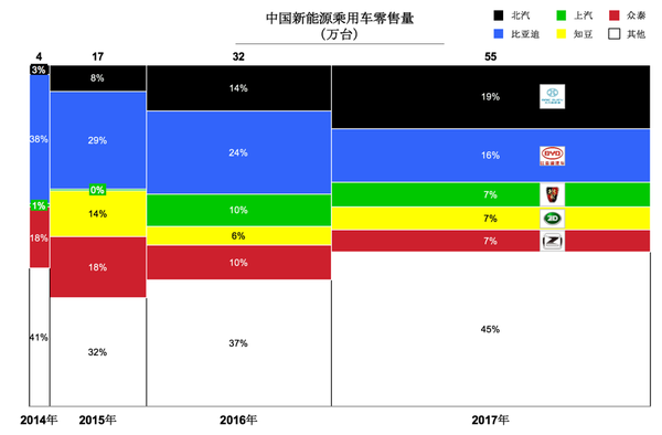 从2014到2017年,北汽新能源(上图黑色面积)份额提升速度迅猛。