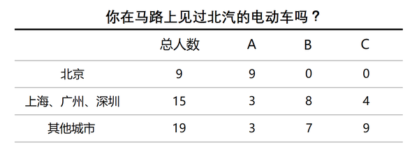 不难看出,北汽新能源在北京地区的影响力最高,所有人都表示经常看到。