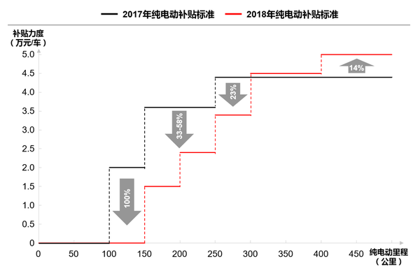 2018年的新能源政策对于小型、低续航里程的的纯电动车型显得“很不友好”。以300公里续航作为分界点来看,低里程的补贴力度大幅跳水,另外还有严格的能量密度以及能耗公式加以限制。以北汽EC为例,2018年的单车国补加地补要减少4万多元。即使北汽有所准备,并且可以立刻把续航升级到200公里,还是与原先的补贴额有较大差距。