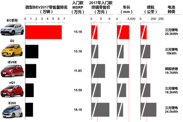 通过对车身尺寸、电池类型&容量、补贴情况进行综合分析,不难看出,北汽EC系列很可能是A00畅销车中,制造成本最高的一款。(采用较贵的三元锂电,车身尺寸和电池容量较大)