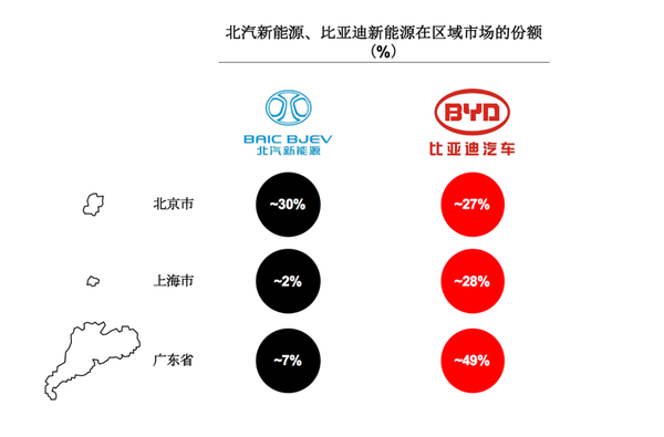 与国内最早布局新能源汽车业务的细分市场领先者比亚迪相比,北汽新能源在全国三大核心市场的表现很不均衡,严重依靠北京的主场优势。