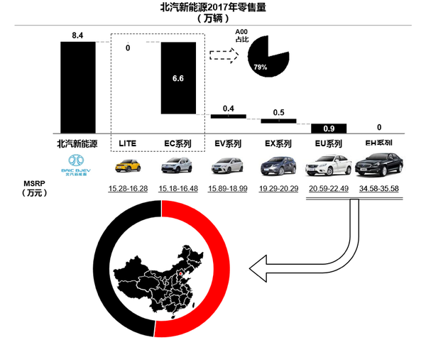 但如果我们剖析一下具体的产品结构,会发现北汽新能源销量主要集中于入门级的A00电动车。