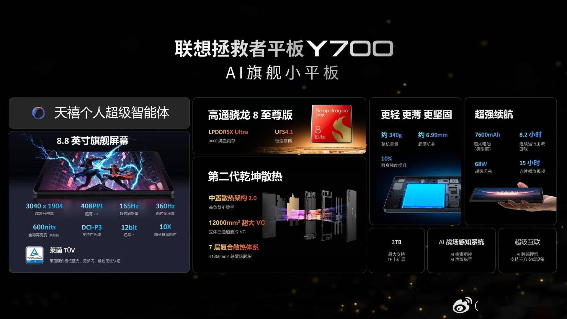新款Y700平板在设计上也进行了诸多优化,机身更加窄小,屏占比更高,视觉效果更加出色。同时,采用了大面积VC均热板,散热性能更加强劲。续航方面,配备了7600mAh的大容量电池,满足用户长时间使用的需求。还配备了双X轴线性马达以及TF读卡槽,最大支持2TB TF卡扩展,为用户提供了更多的便利。