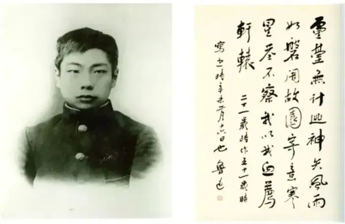 1903年前后,国家生死存亡之际,他剪掉了辫子,拍了张照片,并且把一首诗提在背面送给了好友: