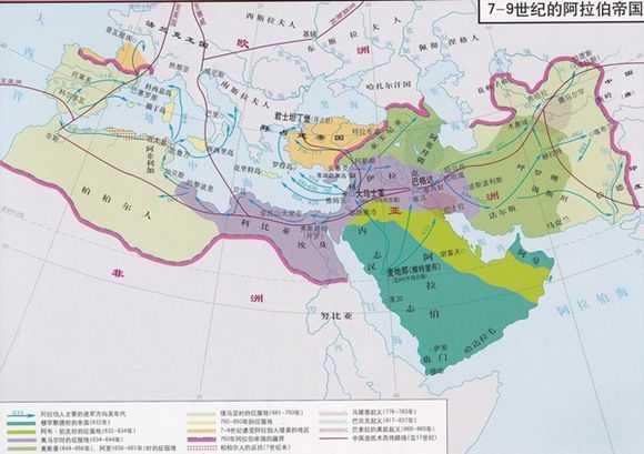 阿拉伯帝国到达鼎盛时期,它不仅拥有整个阿拉伯半岛,更拥有中东、北非和西班牙的广阔地盘。之所以说是鼎盛,是因为阿拉伯人的扩张势头终于被阻遏了:在法国图尔,阿拉伯人被法兰克王国的掌权者“铁锤查理”击退。阿拉伯人的迅猛扩张至此为止,他们已经建成了一个地域辽阔的大帝国。