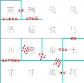 为了方便识别,在每个方格中写了一个汉字,表示该地点在现代世界地图上的主要国家,如英国、法国、德国、意大利、西班牙、土耳其、乌克兰、波兰、埃及,其中一些汉字代表的地点有多个国家,取有代表性的国家的一个字,如瑞字表示瑞典所在的北欧、希字表示希腊所在的巴尔干半岛、阿字表示沙特阿拉伯所在的阿拉伯半岛,最后一行的两个非字,表示西非和北非。这些汉字只用于帮助识别地点,所以使用了不显眼的灰色。