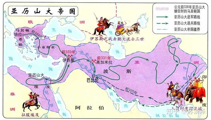 亚历山大继位后,首先平息了企图趁老王亡故之机摆脱马其顿控制的城邦的起义,然后他开始远征,他的第一个目标是波斯,上个世纪波斯焚烧雅典的仇恨还在希腊人心中根深蒂固,亚历山大又给波斯加上了刺杀腓力二世的凶手的指使者的罪名,他于公元前334年出征,到公元前330年,将曾经盛极一时的波斯帝国彻底灭亡,在这之前,埃及和美索不达米亚已经被他征服而成为领土。