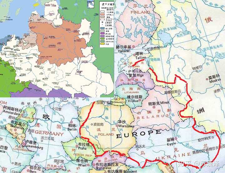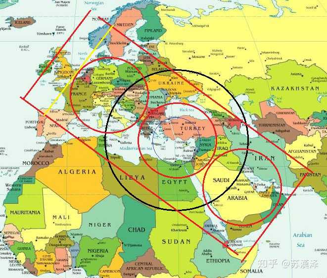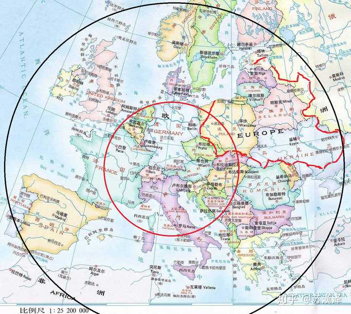 黑圈范围内,只有北非、前苏联加盟国以及永久中立国等总面积不太大的部分没有加入欧盟。欧盟的大体范围,跟战略意义的欧洲几乎重合