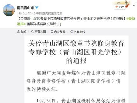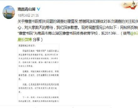 2017年10月30日晚,南昌市青山湖区官方微博发布调查结果。经调查,网贴反映的问题部分存在,书院确有罚站、打戒尺、打竹戒鞭等行为和相关制度。对此,已责成区教科体局依法依规对该教育机构进行处罚,对于相关责任人员进行追责。