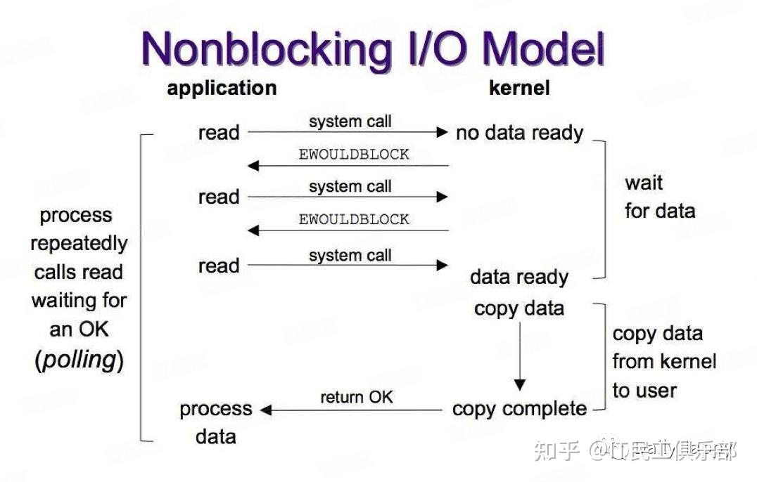 当用户进程发出 read 操作时,如果 kernel 中的数据还没有准备好,那么它并不会 block 用户进程,而是立刻返回一个 error。从用户进程角度讲 ,它发起一个 read 操作后,并不需要等待,而是马上就得到了一个结果。用户进程判断结果是一个 error 时,它就知道数据还没有准备好,于是它可以再次发送 read 操作。一旦 kernel 中的数据准备好了,并且又再次收到了用户进程的 system call,那么它马上就将数据拷贝到了用户内存,然后返回。所以,用户进程其实是需要不断的主动询问 kernel 数据好了没有。