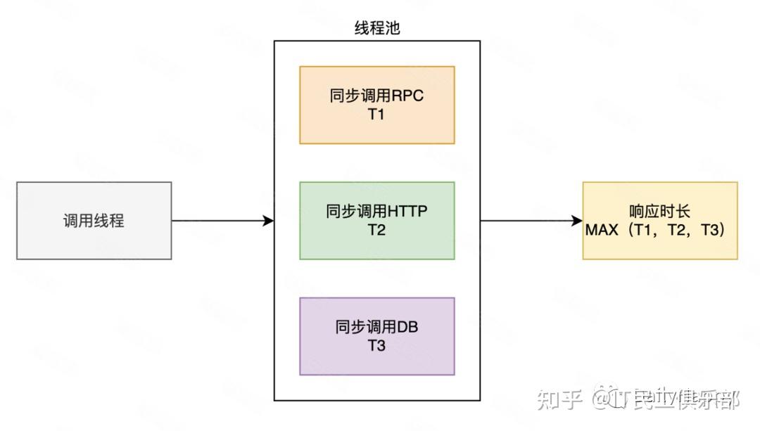 一般这个时候为了减少同步等待时间,会使用线程池来同时处理多个任务,接口的响应时间就是 MAX(T1,T2,T3):