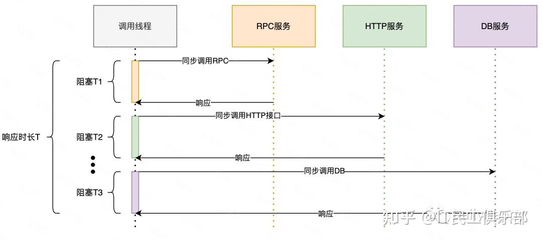 在同步调用的场景下,依次请求多个接口,耗时长、性能差,接口响应时长 T > T1+T2+T3+……+Tn。