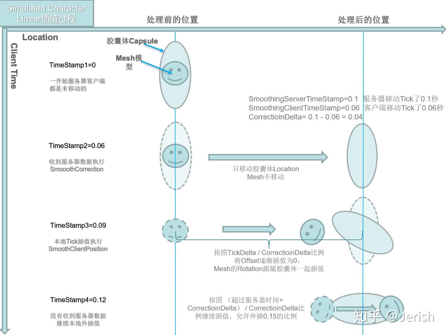 为了避免这种“突变”情况,UE采用了Mesh网格的平滑操作。胶囊体的移动正常进行,但是其对应的Mesh网格不随胶囊体移动,而要通过simulateTick的SmoothClientPosition处理。在SmoothNetUpdateTime时间内,移动组件会通过ClientData->MeshTranslationOffset去差值平滑Mesh相对胶囊体的偏移而并不会修改胶囊体的坐标,这样在通常情况下玩家在视觉上就不会觉得代理角色的位置突变。通过FScopedPreventAttachedComponentMove类可以限制某个组件暂时不跟随父类组件移动。(可参考:UCharacterMovementComponent的SmoothClientPosition_UpdateVisuals)