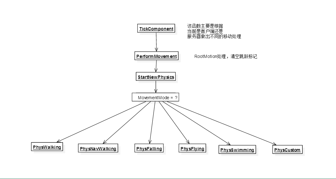 这一节我们把焦点集中在UCharacterMovementComponent组件上,来详细的分析一下他是如何处理各种移动状态下的玩家角色的。首先肯定是从Tick开始,每帧都要进行状态的检测与处理,状态通过一个移动模式MovementMode来区分,在合适的时候修改为正确的移动模式。移动模式默认有6种,基本常用的模式有行走、游泳、下落、飞行四种,有一种给AI代理提供的行走模式,最后还有一个自定义移动模式。