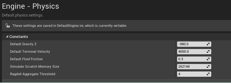 Volume里面会取WorldSetting里面的GlobalGravityZ,这里给我们一个提示,我们可以通过修改代码实现不同Volume的重力不同,实现自定义的玩法。注意,即使我们没有处在任何一个体积里面,他也会给我们的UpdateComponent绑定一个默认的DefaultVolume。那为什么要有一个DefaultVolume?因为在很多逻辑处理上都需要获取DefaultVolume以及里面的相关的数据。比如,DefaultVolume有一个TerminalLimit,在通过重力计算下降速度的时候不可以超过这个设置的速度,我们可以通过修改该值来改变速度的限制。默认情况下,DefaultVolume里面的很多属性都是通过ProjectSetting里面的Physics相关配置来初始化的。参考图3-4,