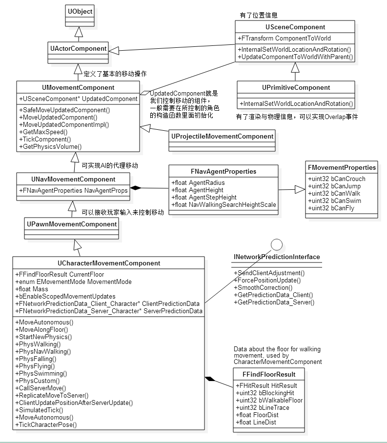 移动组件类一共四个。首先是UMovementComponent,作为移动组件的基类实现了基本的移动接口SafeMovementUpdatedComponent(),可以调用UpdateComponent组件的接口函数来更新其位置。