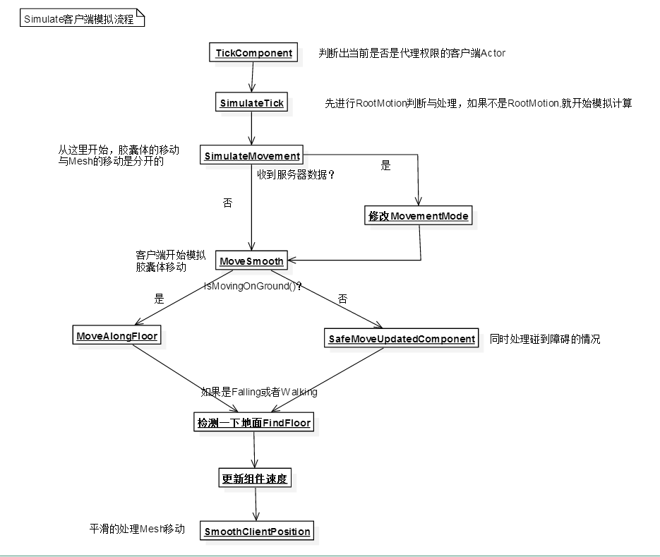了解了这些同步的数据后,我们开始分析其移动流程。流程如下图所示(RootMotion的情况我在上一章节已经描述,这里不再赘述)。其实其基本思路与普通的移动处理相似,只不过是调用SimulateTick去根据当前的速度等条件模拟客户端移动,但是有一点非常重要的差异就是Simulate的角色的胶囊体移动与Mesh移动是分开进行的。这么做的原因是什么呢?我们稍后再解释。