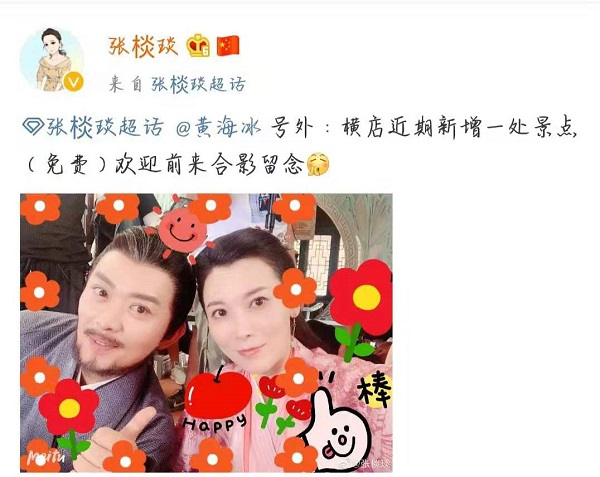9月17日,张棪琰在个人社交平台晒出一张和黄海冰的合照,并配文:“号外:横店近期新增一处景点(免费)欢迎前来合影留念。”黄海冰和张棪琰两人曾在《武林外史》中饰演沈浪和朱七七,成为影视剧经典形象。网友们见此合照也纷纷掀起回忆,有网友表示:“恍如隔世,好像小时候的愿望实现了,七七和沈大哥在一起中年的样子。“也有人觉得:”我爱的剧,我爱的人儿,二十年后依然有售后,活久见系列。“