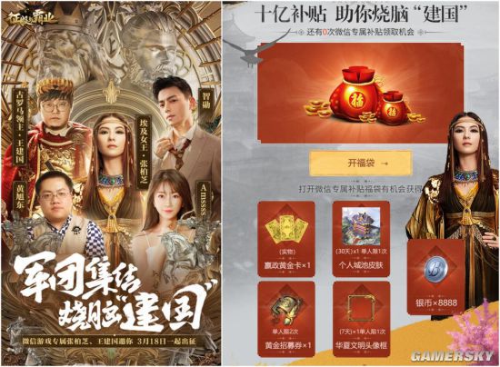 惊喜加码,#十亿补贴 烧脑“建国”#活动仍在进行中!玩家现在报名活动即有机会领取价值298元礼包;还能抽卡抢先赢得橙色品质将领,更有定制实体金卡大奖!成功报名并绑定角色id的玩家,在游戏上线当日提升“势力值”达到2000,即可免费获得18元月卡。惊喜加码,玩家还能解锁丰厚大礼——各榜单前108名的玩家将能获得“定制实体金卡”,其他参与活动的玩家则有机会获得腾讯视频vip或“东方风格高级个人城池皮肤(永久)”等福利!