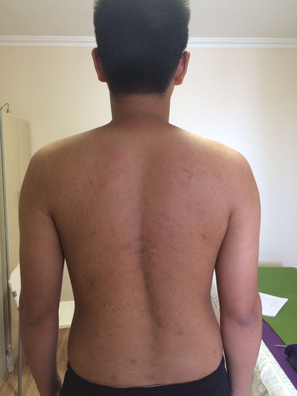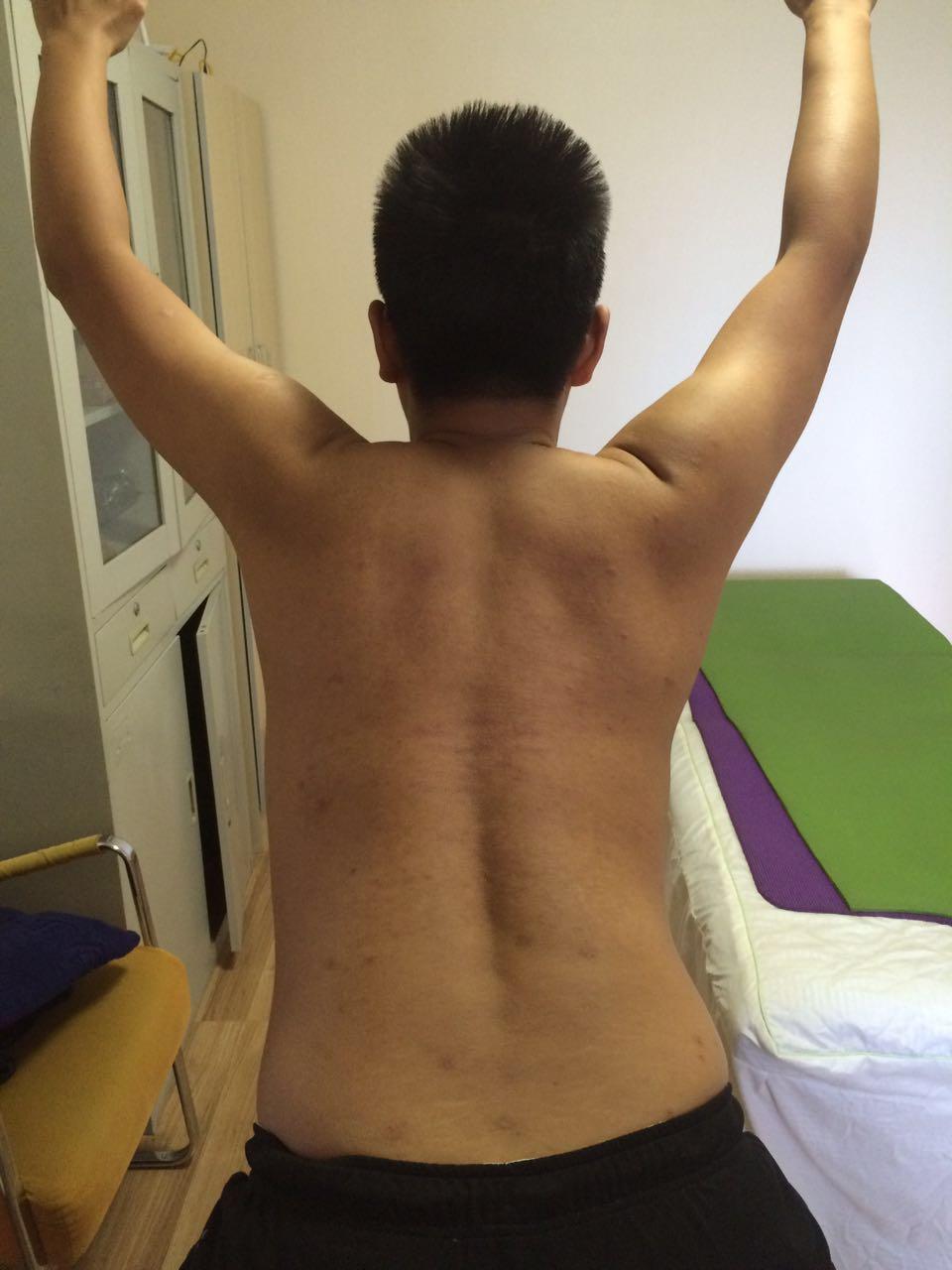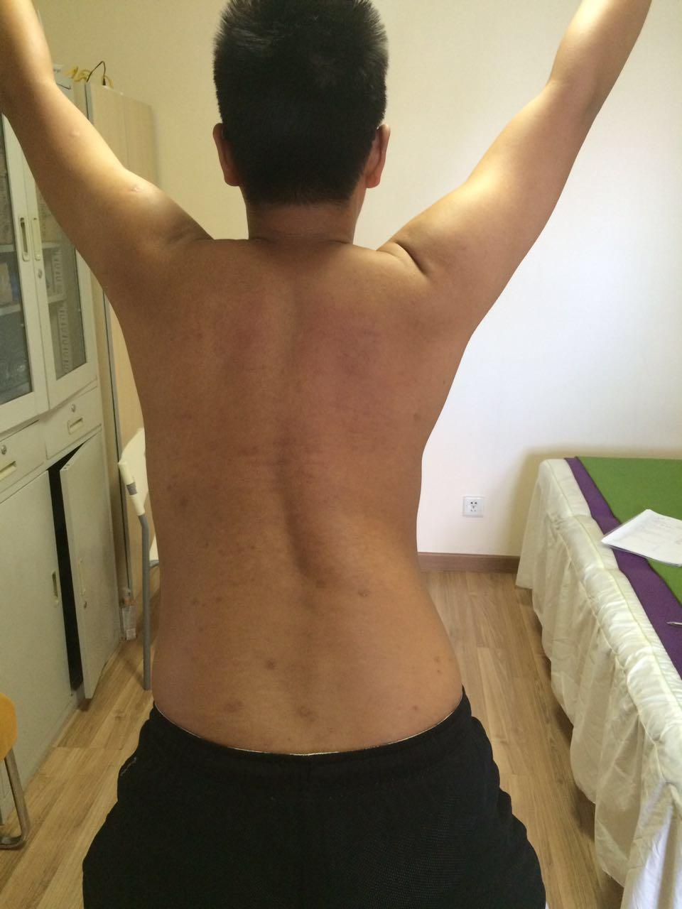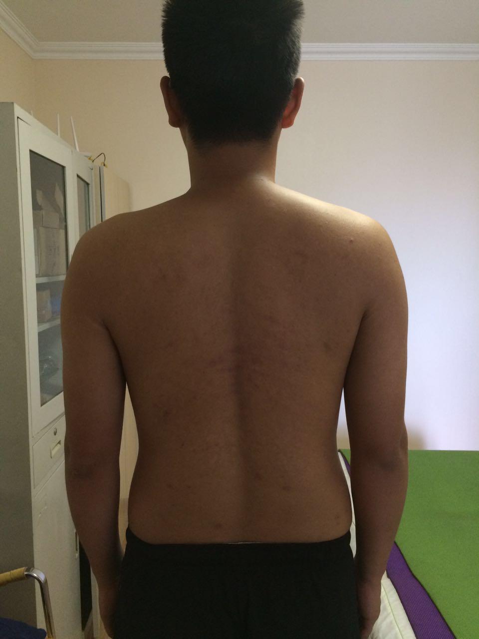 我们可以让患者露出整个后背,自然站立位。康复师在其身后观察评估。