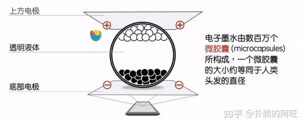 电子墨水由数百万个微胶囊(Microcapsules)构成,微胶囊的大小约等同于人类头发的直径。每个微胶囊里含有电泳粒子──带负电白色和带正电黑色粒子,悬浮于透明液体中。利用正负相吸原理,当电场接通时,该区块对应的黑或白粒子会移动至微胶囊的顶端,使用者在该区块上,就能看见白色或黑色。
