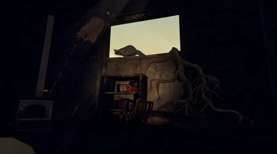 452洞穴(CAVE 452) 到 熊牙点 (BEARTOOTH POINT) 的路线上有一块往东边凸起的空地,那里有一座烧焦到变形的旧屋子。屋子下有个黑黢黢的地下室,地下室有个黑黢黢的火炉,小浣熊躲在炉门里边儿了。建议第3天之后再去。