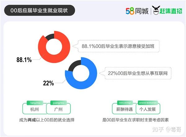 面对严峻的就业形势,00后们的心情其实是焦急乃至焦虑的,79%的人表示希望立即参加工作,88.1%的人表示愿意加班,只是比起纯粹的“赚钱”,职业发展和个人价值在00后心中也一样重要。
