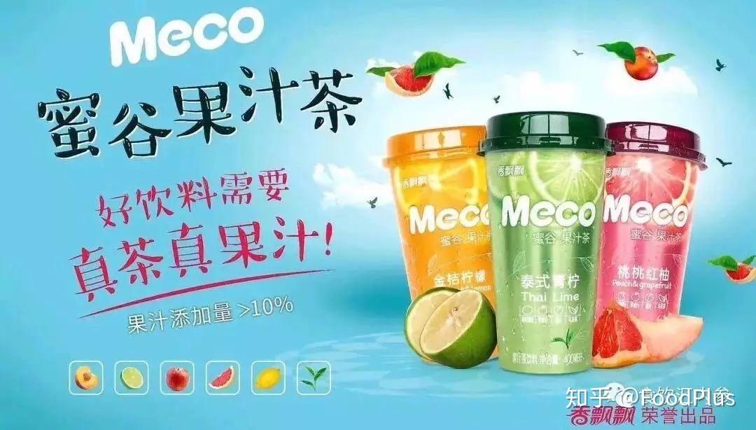号称中国“奶茶第一股”的香飘飘也在通过品类拓展探索新的增长机会。除了在2017年11月推出即饮的液体奶茶——Meco牛乳茶外,今夏香飘飘推出了Meco蜜谷果汁茶系列,定位果汁茶系列。
