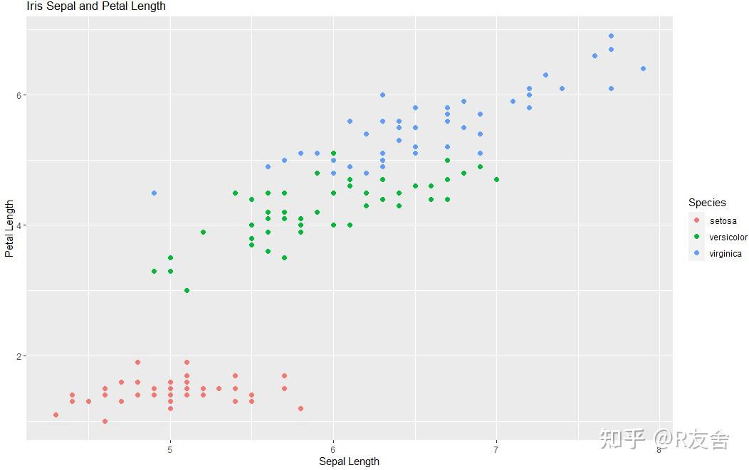 我们采用的数据集是`iris`,该数据集包含了150朵鸢尾花的测量数据,其中包括花瓣长度、花瓣宽度、花萼长度、花萼宽度以及所属鸢尾花的种类。这里我们用ggplot2绘制散点图,其中横坐标为花萼长度,纵坐标为花瓣长度,颜色根据花的种类进行分类。