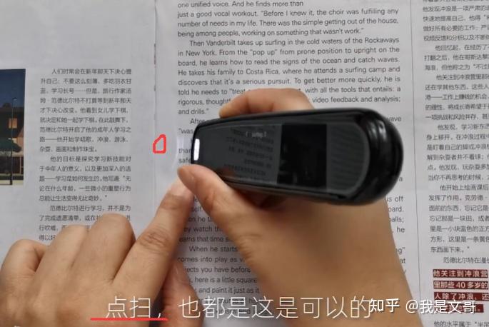 【 点,扫 】快速翻译。就像下图,在笔头处有一个按动机关,按下后启动摄像头识别词句。滑动笔就可以把 单词 或者 一句话 识别出来,然后翻译或者识别读出来。多数词典笔支持多行扫描,再也不用担心句子的翻译。