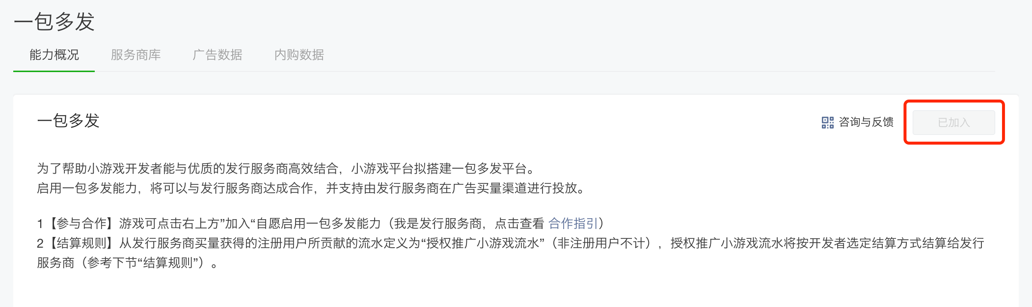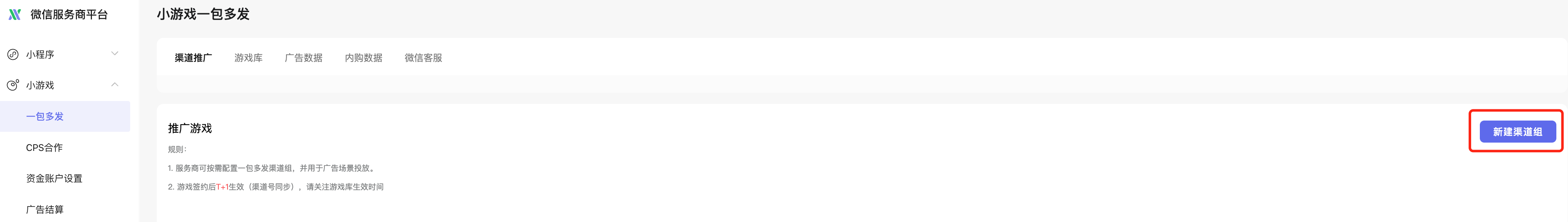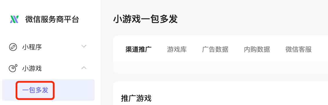 开展一包多发的“服务商-小游戏”之间需完成授权绑定。【测试期间】有合作小游戏的服务商,可联系微信小游戏平台(小游戏助手wx:minigame3)进行关系绑定,开展合作。