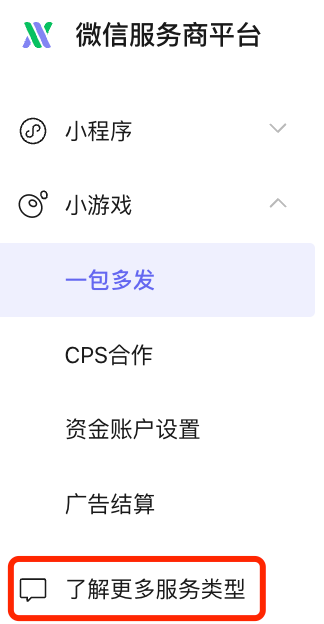 Step1:由小游戏开发者在微信公众平台(mp.weixin.qq.com) - 成长 - 一包多发 模块选择对应的服务商发起合作;