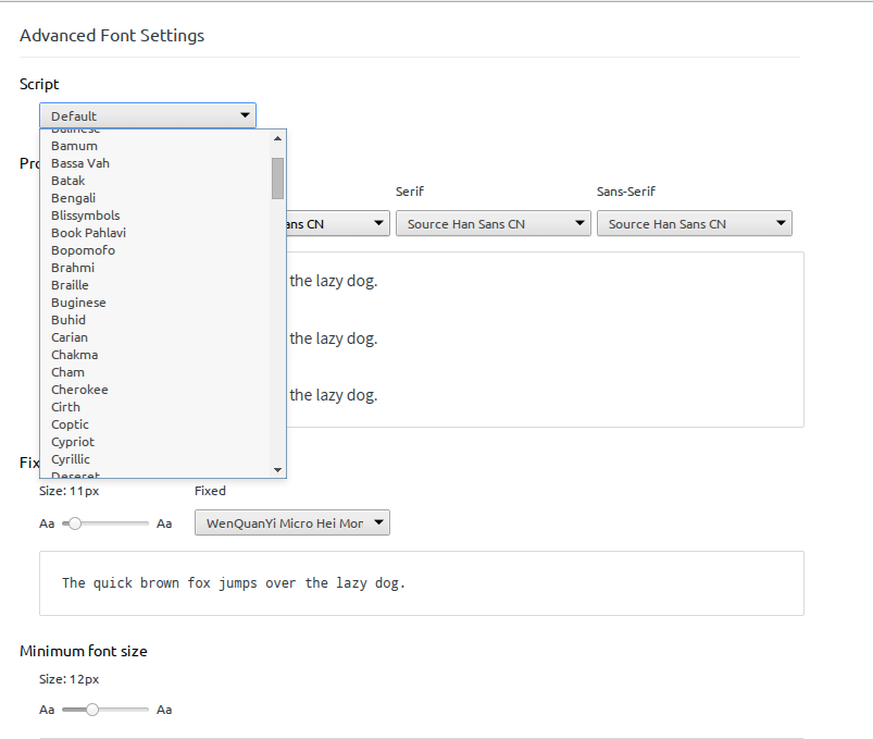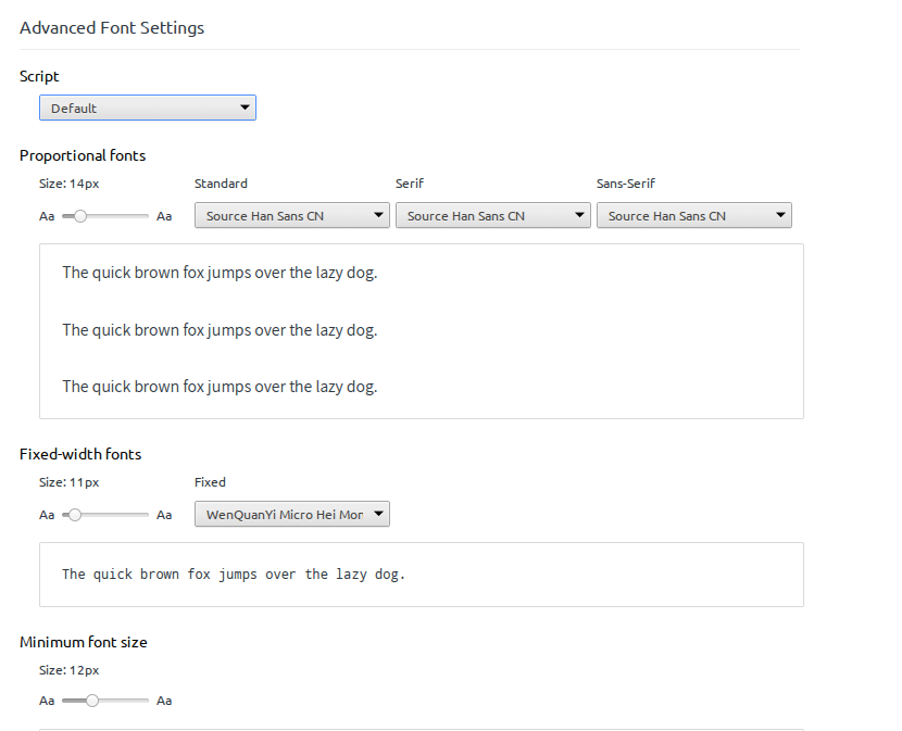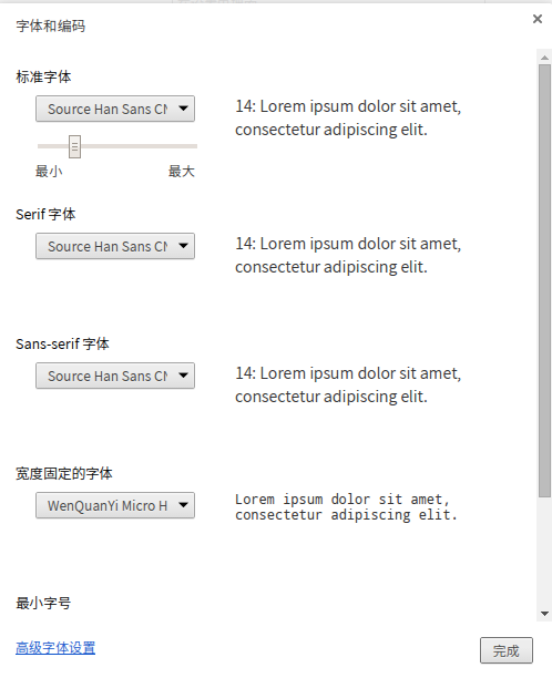 https:// chrome.google.com/webst ore/detail/advanced-font-settings/caclkomlalccbpcdllchkeecicepbmbm?hl=zh-CN可以设置 不同语言 下的常规、默认衬线字体、默认无衬线字体、等宽字体的字体设置与缩放比例。我记得不装这个插件好像也会提示来着。