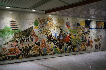 该站长幅壁画《宣南文化》,反映了以先农坛为代表的皇家祭祀文化、以琉璃厂为代表的京城士人文化、以湖广会为代表的会馆文化、以大栅栏地区老字号店铺为代表的传统商业文化、以天桥为代表的老北京民俗文化等。