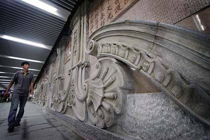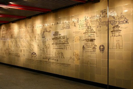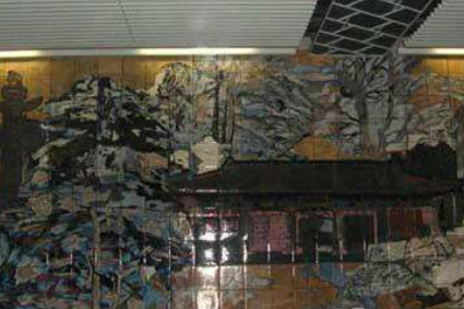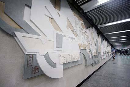 该站装饰墙选取北京大学有代表性、具有历史文化内涵的标志性建筑物,构成画面的主体物象,并有湖水树石穿插其中,烘托出百年老校庄重、和谐的校园气氛与悠长的文化意味。