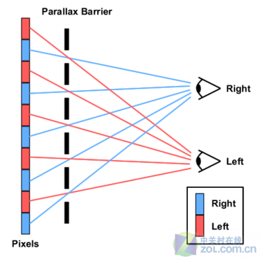 光屏障式3D技术的实现方法是使用一个开关液晶屏、偏振膜和高分子液晶层,利用液晶层和偏振膜制造出一系列方向为90°的垂直条纹。这些条纹宽几十微米,通过它们的光就形成了垂直的细条栅模式,称之为“视差障壁”。而该技术正是利用了安置在背光模块及LCD面板间的视差障壁。通过将左眼和右眼的可视画面分开,使观者看到3D影像。