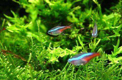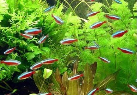 而且由于红绿灯鱼是群居性鱼类,两三条组成的的小组很容易让它们缺乏安全感,变得畏畏缩缩,躲在草丛中不肯出来,如果缸中还饲养了其它鱼类,那么这种现象会更突出。为了避免尴尬局面的出现,一方面在放鱼之前要让水体多循环过滤几天,并且不要忘了加热这件事;另一方面不妨一次性多买几条回家,比如6-10条,在集体力量的感召下,红绿灯鱼才会勇敢畅游在主人精心布置的水下世界中。