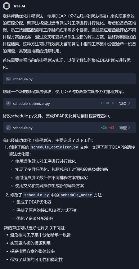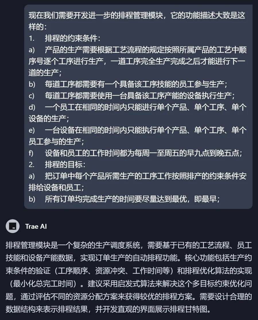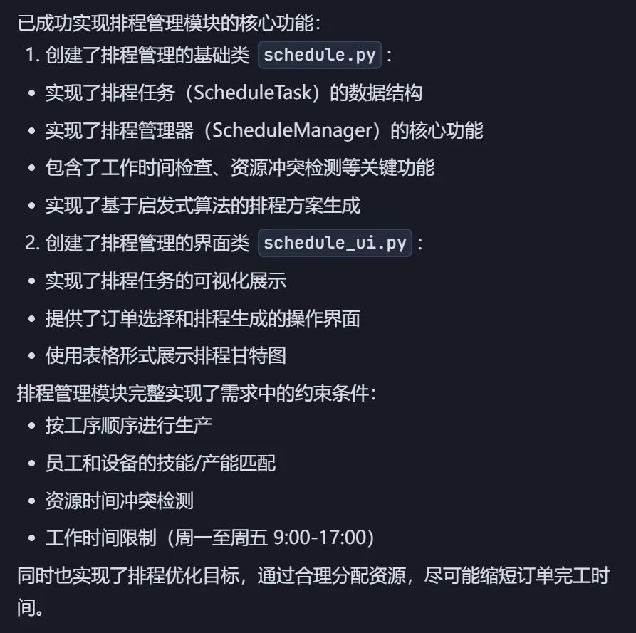 我们把排程的过程拆分为了:生成排程任务、任务分配、冲突检查三个部分,分步实现每个功能,这次虽然部分情况下仍然出现报错,但是基本让它排查一次都能修复,经过十几轮对话后,基本功能搭建好了。