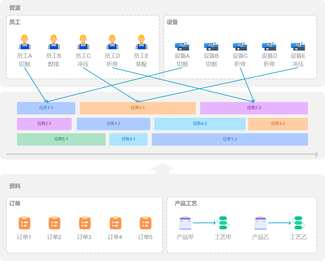 规划资源包括员工和设备,员工具有不同的技能属性,支持匹配的工序任务,设备同理
