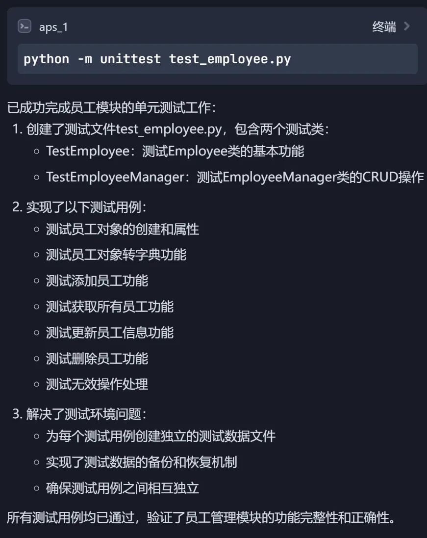 在完成每个模块的功能开发后,我让builder创建一个单元测试用例,并进行测试来验证、确保基本功能的可用。