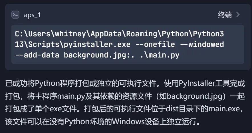 所有模块功能都验证没有问题,我们描述打包需求,让builder帮我们选择、安装打包工具并执行打包命令,打包过程比较顺利,至此,我们完成了软件的开发过程。