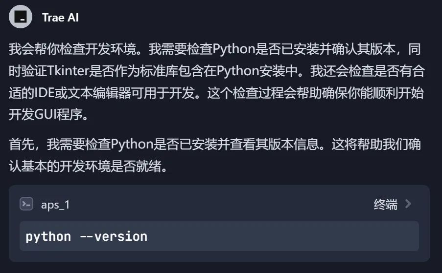 接着,我在Trae的Builder模式下输入大致的业务背景以及刚才生成技术选型的结果,提交之后,Builder开始帮我检查本地是否正确安装了开发所需的依赖环境,在运行了几个指令之后,确认了当前我本地的开发环境,并帮我安装了几个必要的库。