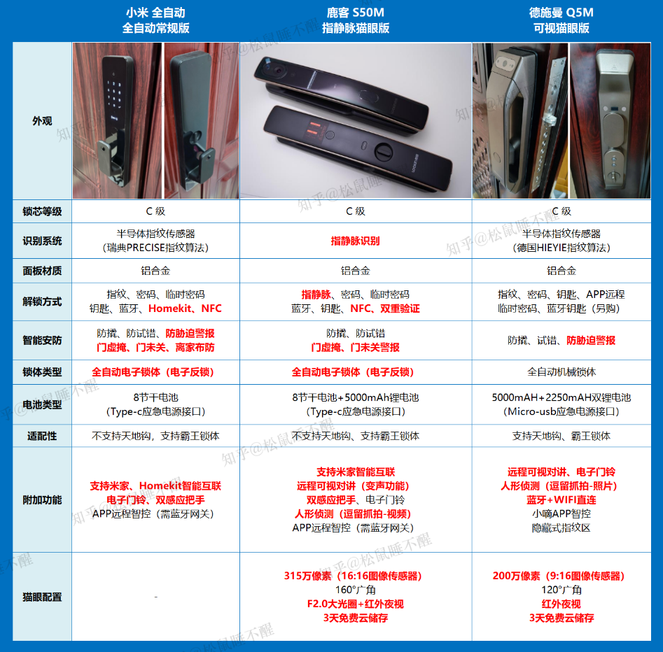 我们可以从 “小米、鹿客” 和 “德施曼” 之间各取一款最能诠释品牌特色的型号做个比较。
