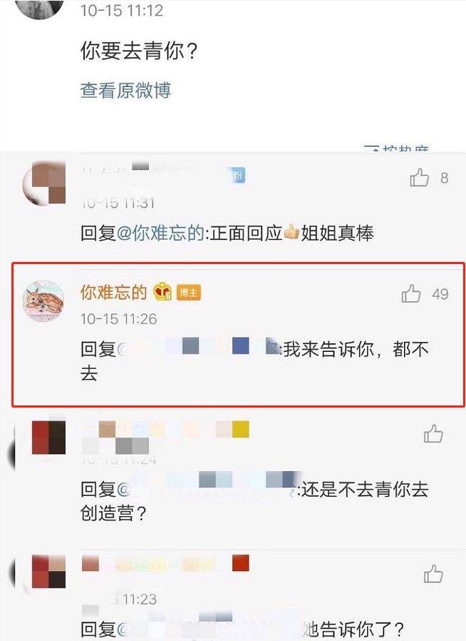 之前传出她去参加选秀时就有人留言求证,但很快就被她以“我来告诉你,都不去”强硬否认了。