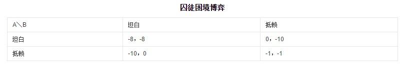 表中的数字表示A,B各自的判刑结果。博弈论分析中一般都用这样的表来表示。