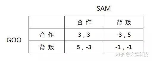 上图表格模拟了两家公司的博弈现状,双方各有两个可选策略“合作”与“背叛”,格中的四组数据表示四个博弈结局的分数(收益),每组数据的第一个数字表示GOO公司的收益,后一个数字表示SAM公司的收益。