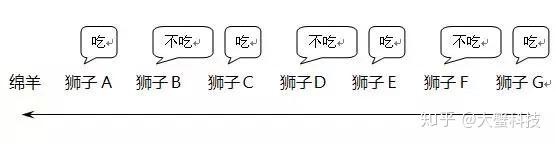 但是,如果我们在狮子F的后面增加了一只狮子G,总数变成7只,用逆向分析法按照上题步骤再推一次,很容易得出结论:狮子G吃,狮子F不吃,E吃,D不吃,C吃,B不吃,A吃。这次的答案变成了狮子A敢吃掉绵羊。