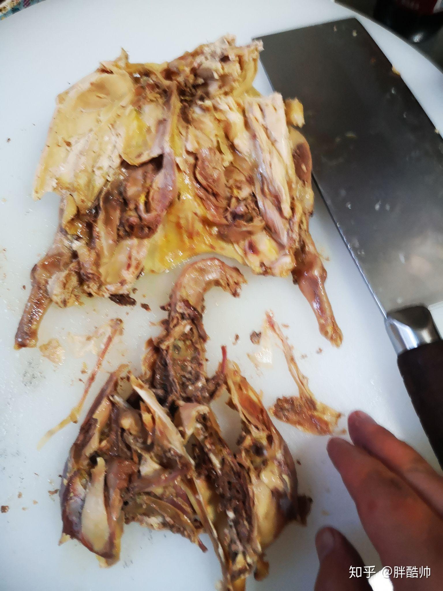 鸡腹一刀破开,趁热拆骨,留下肉皮,再冷一点好切但是又容易肉骨粘连。